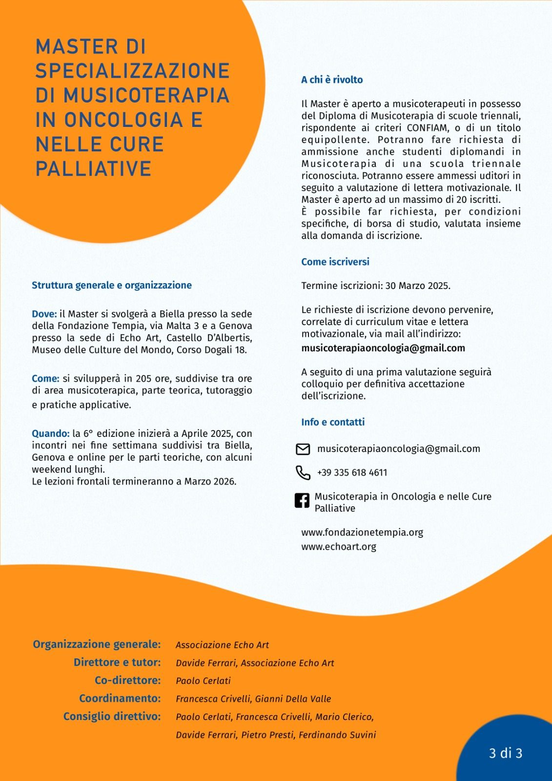 Da circa 15 anni collaboro con Day Hospital oncologico con piccoli gruppi di pazienti.